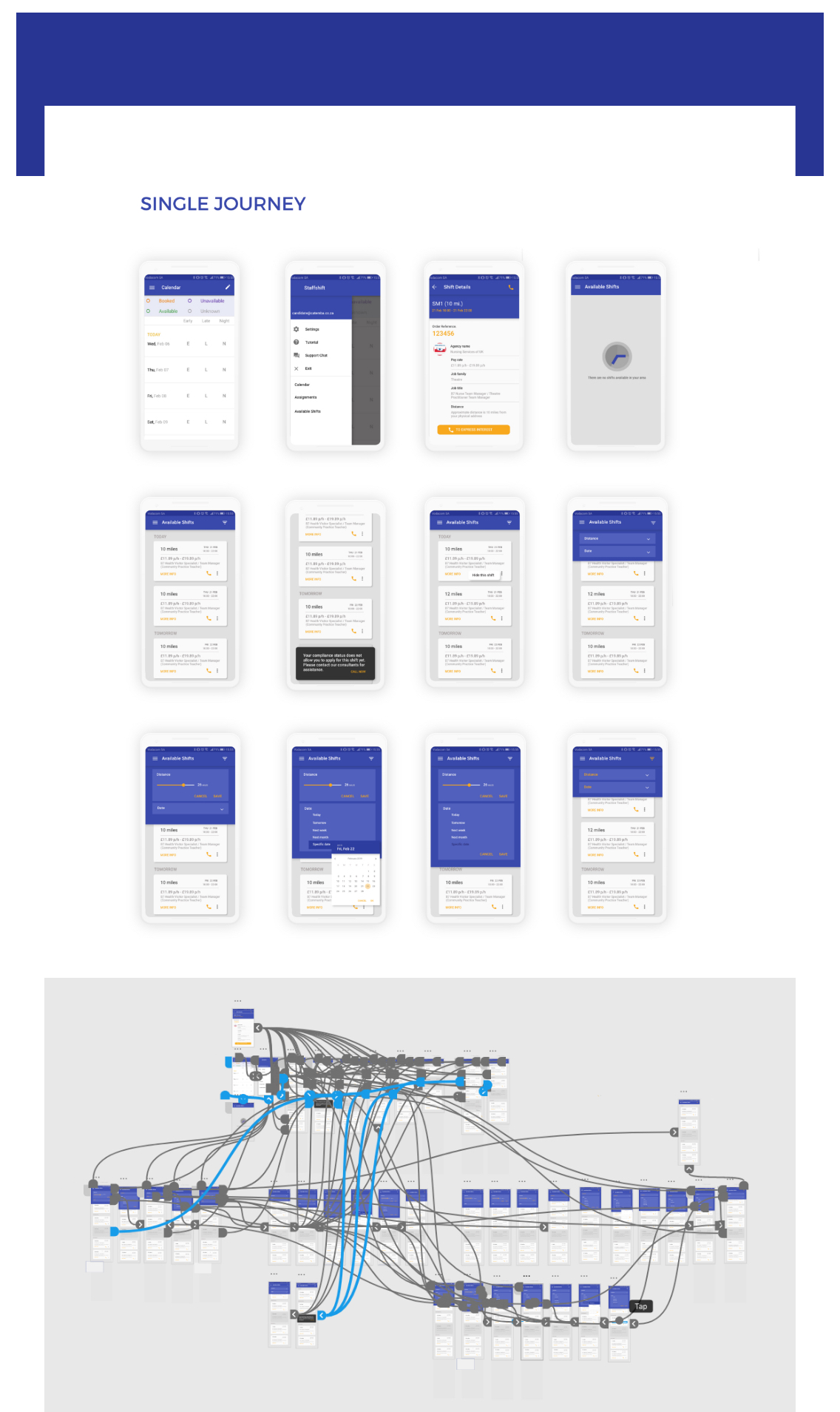 OBJECTIVE: I designed a new feature on their app. This feature allows candidates to express interest in possible available shifts in their area. We did not want to lose staff members as this could possibly replace jobs, so instead of the candidates booking from the app, they have to phone in to have consultants book them for the shifts they are interested in. This design focusses on brand experience optimization and understanding the technical capabilities and limitations of the developers.